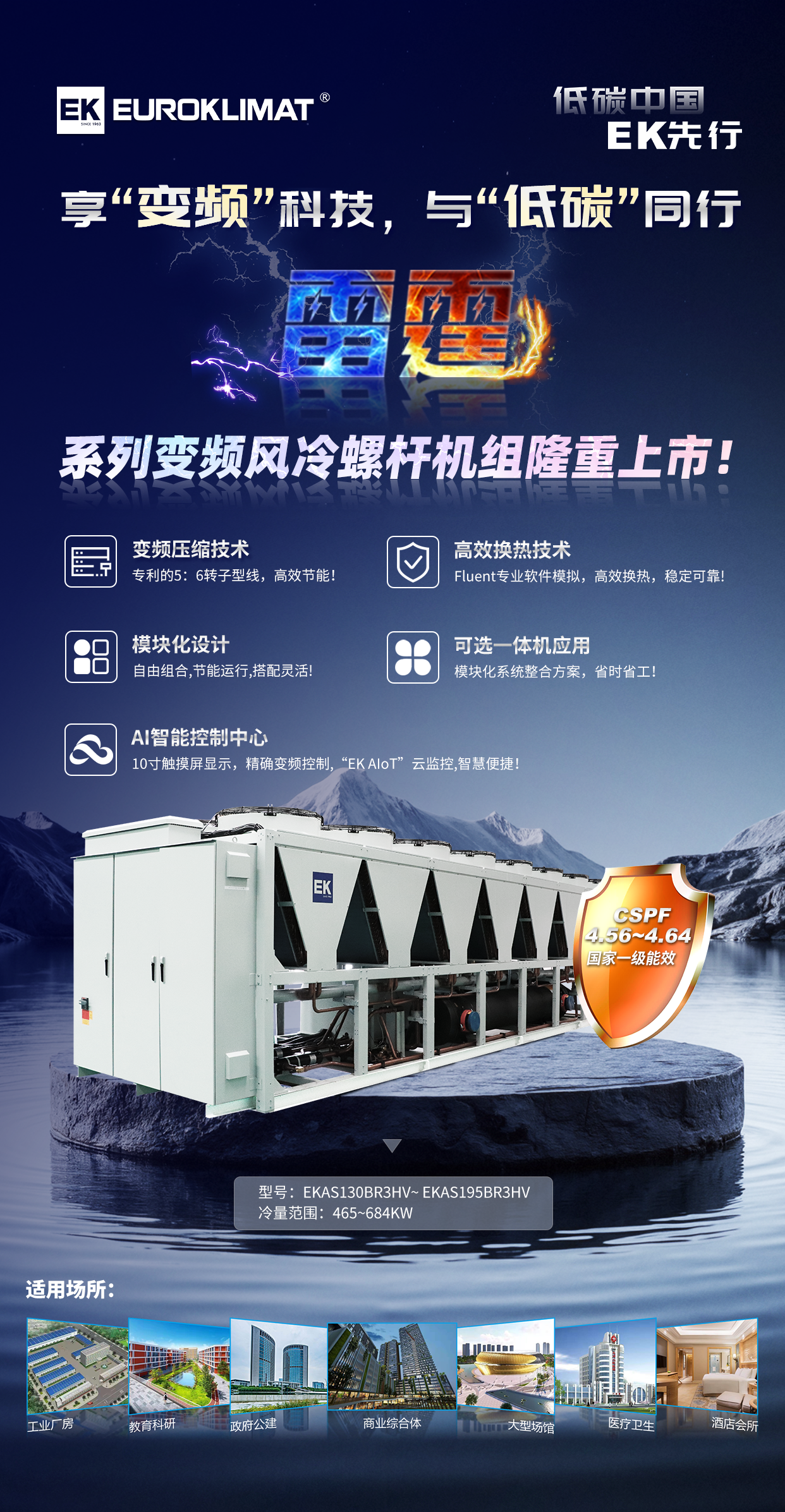 享“變頻”科技,與“低碳”同行!“雷霆”系列變頻風(fēng)冷螺桿機(jī)組隆重上市!2025-07-15EK“雷霆”系列變頻風(fēng)冷螺桿機(jī)組隆重上市!
