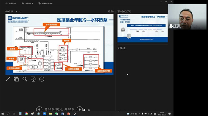 交流會上,EK空調水系統產品經理呂芳玉通過廈門大學附屬翔安醫院的案例,詳細和大家介紹了四管制、三管制、全熱回收、多聯機等EK空調設備在醫院手術室、醫技樓、藥物配制區、住院樓、門診等不同場景的應用,并展示了近幾年EK空調在全國各地的重點樣板工程。EK空調技術應用總監莊寅還通過線上方式與建科院的專家及設計師們進行了深度交流與探討,現場氣氛熱烈。