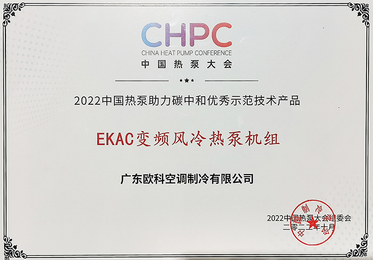 同時,EK旗下EKAC變頻風冷熱泵機組憑借高能效、節能環保等特點,成功斬獲“2022中國熱泵助力碳中和優秀示范技術產品”獎。