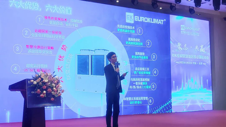 EK空調(diào)產(chǎn)品經(jīng)理陳旭金以《變頻模塊機(jī),暖通空調(diào)工程商的下一桶“金”》為主題進(jìn)行產(chǎn)品宣講