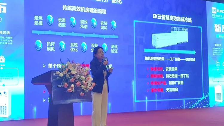 EK空調(diào)產(chǎn)品經(jīng)理呂芳玉以《高效機(jī)房一步到位——EK云智慧高效集成冷站應(yīng)用》為主題進(jìn)行產(chǎn)品宣講