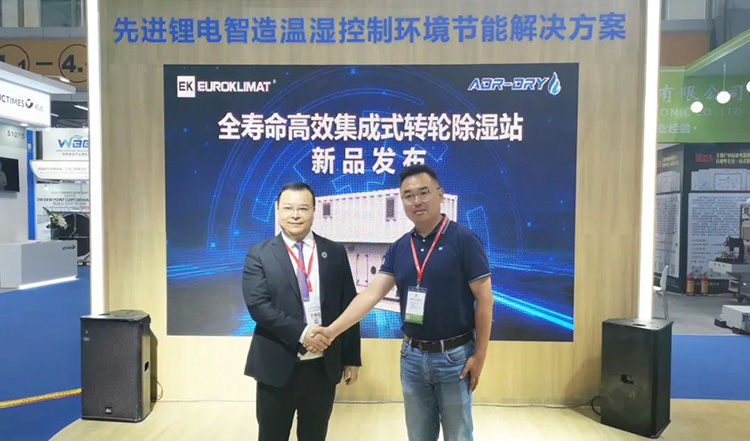 2023 世界電池產業博覽會期間,在廣東省電池行業協會秘書長唐長江,EK中國區市場營銷總監兼IECD事業部總監王健、兩廣區區總陽柳、IECD事業部經理蔡曉輝等行業專家和企業領導的共同見證下,EK舉行了全壽命高效集成式轉輪除濕站新品發布儀式。