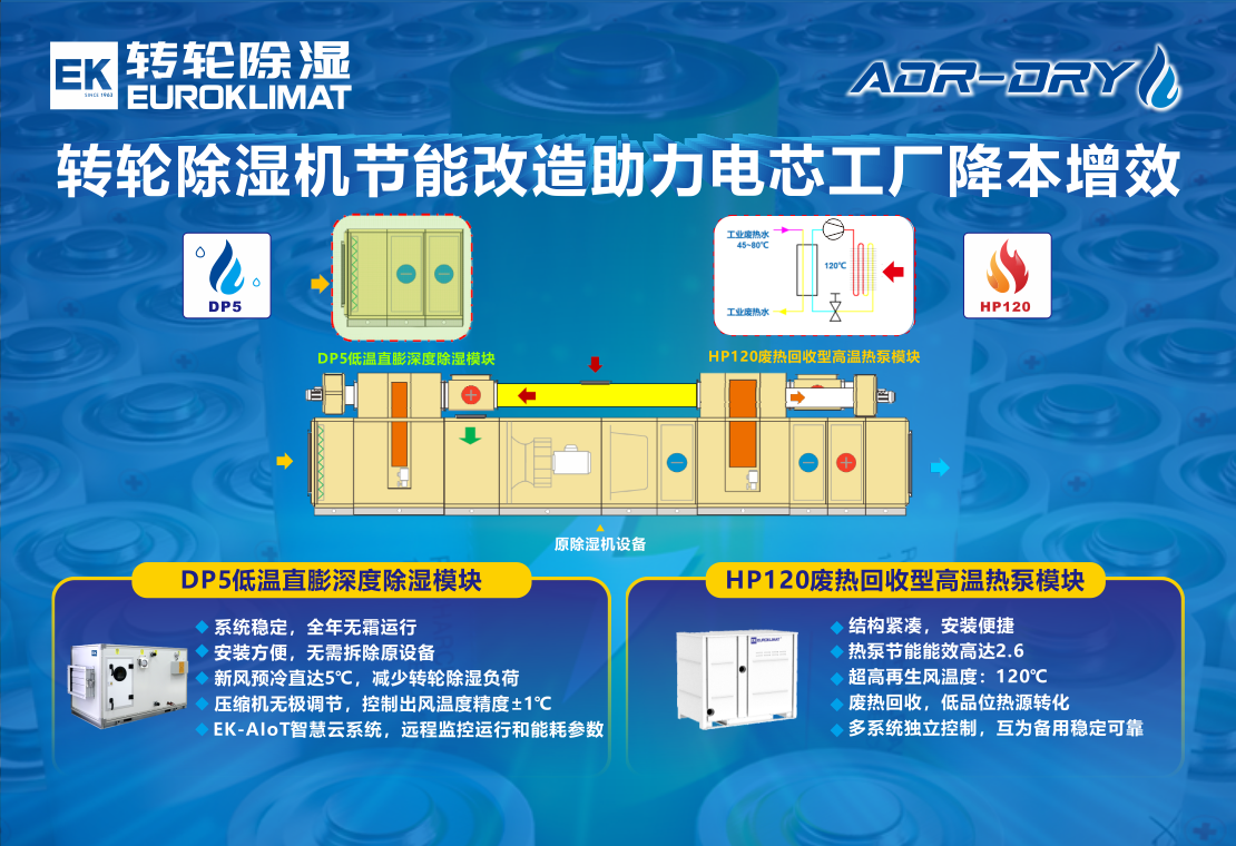 基于此,EK中國區市場總監兼IECD事業部總監王健發表了主題為《轉輪除濕機節能改造助力電芯企業降本增效》的演講,介紹EK工業空調的除濕機節能改造方案,并重點推介了EK工業空調在轉輪除濕機領域的兩大核心技術——DP5低溫直膨深度除濕模塊、HP120廢熱回收型高溫熱泵模塊。