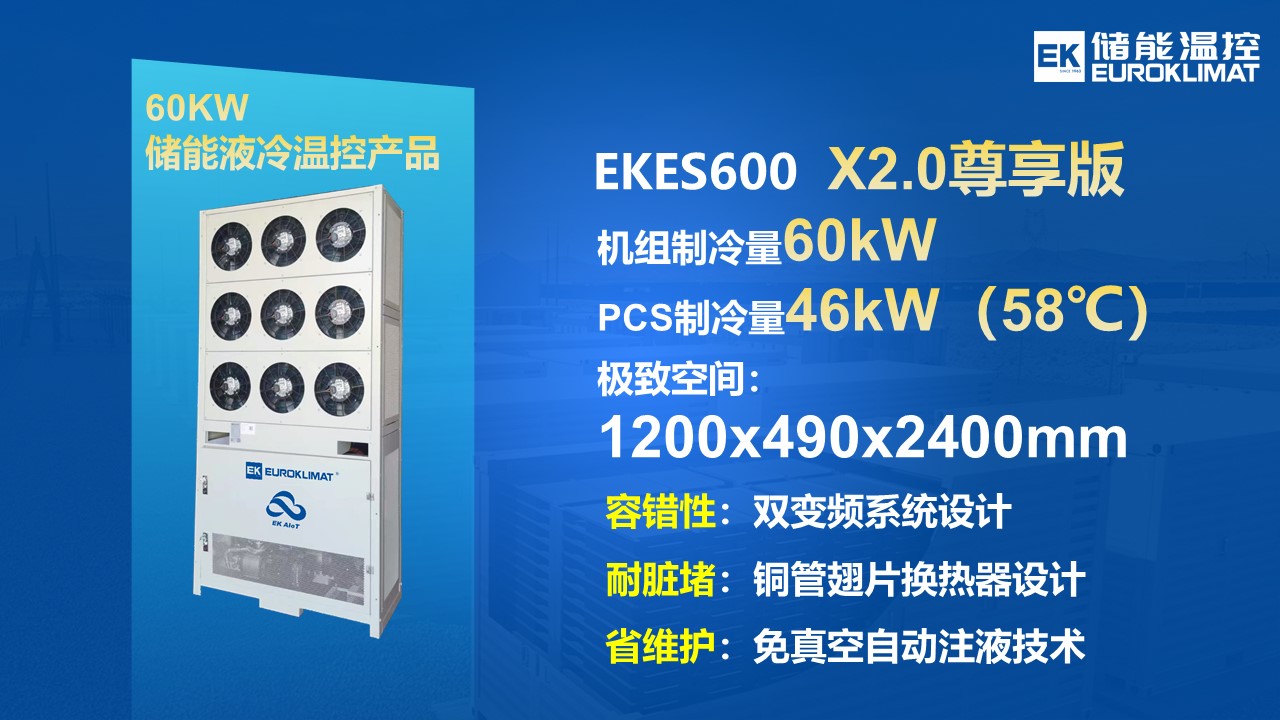 隨著5MWh 儲能系統功率和能量密度的提高,對集成能力的要求也越來越高,提升電芯的散熱性能和溫度均衡能力變得尤為重要。為滿足這一行業趨勢,EK儲能溫控創新推出了EKES600榮耀版液冷溫控解決方案和EKES600X2.0尊享版液冷溫控解決方案。 EKES600X2.0尊享版液冷溫控解決方案是5MWh 液冷PCS的20尺柜一體化集成方案,采用PACK PCS融合液冷的溫控設計,系統采用FCT3.0自然冷技術,過渡季節及冬季利用自然冷源調節所需冷量,使得系統運行能效提升。另外采用全變頻設計,高效節能;雙變頻系統設計更具容錯性,銅管翅片換熱器設計耐臟堵,免真空自動注液技術省維護。機組一體化設計,結構緊湊,節省空間。產品實現儲能環境和電網系統全適應,保障儲能系統長效運行。