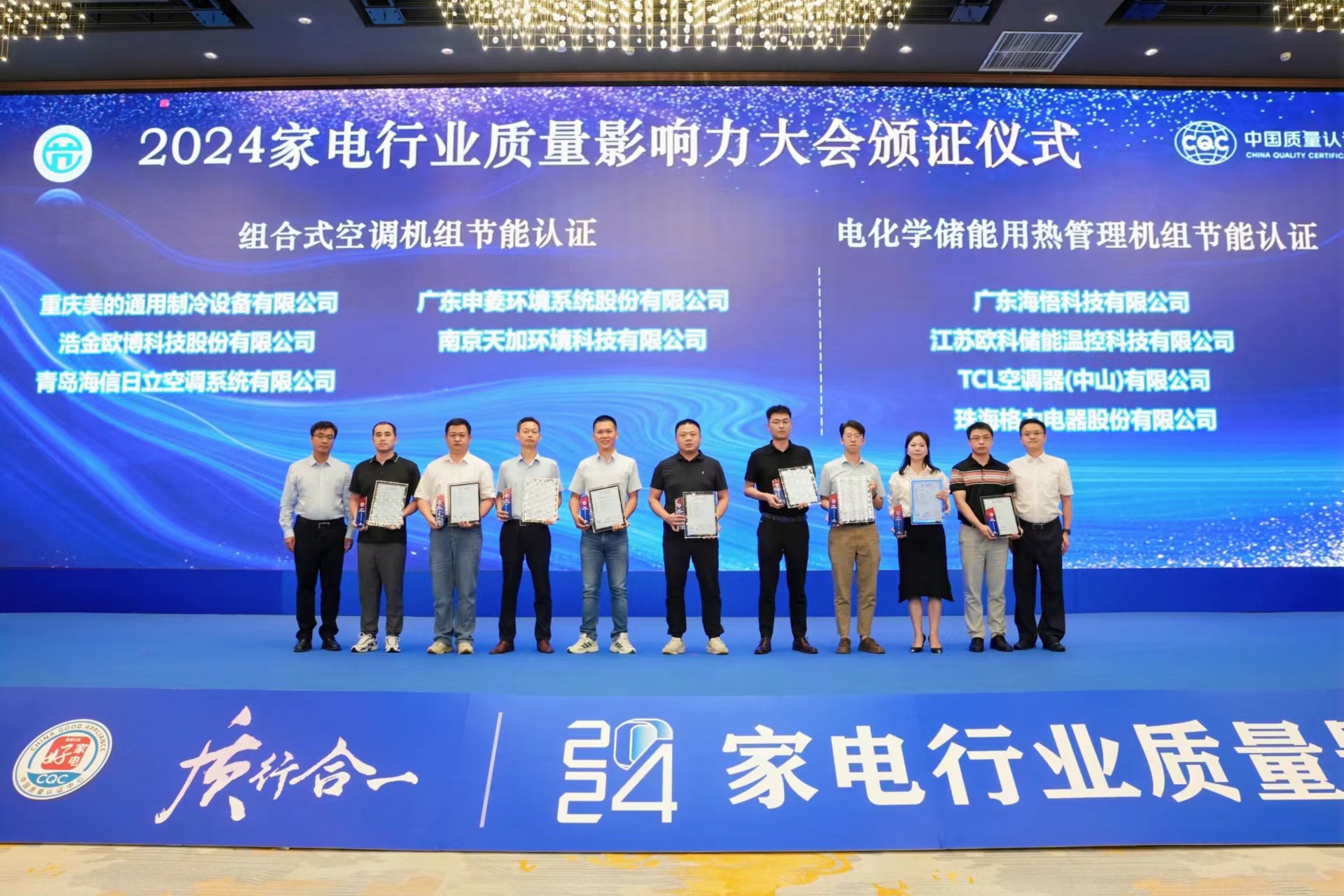 在2024家電行業(yè)質(zhì)量影響力大會頒證儀式上,EK榮獲電化學(xué)儲能用熱管理機組節(jié)能認證。