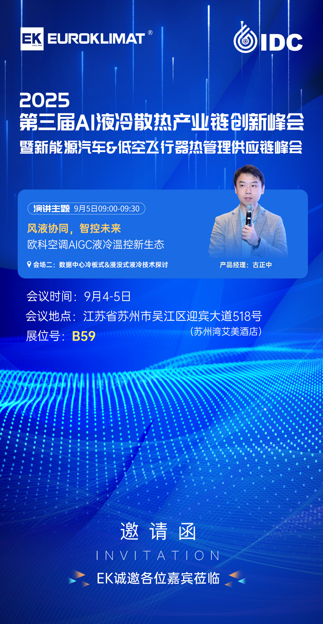 2、EK數據中心產品經理古正中將于9月5日上午在 “數據中心冷板式&浸沒式液冷技術探討”分會場發表題為《風液協同,智控未來——EK空調AIGC液冷溫控新生態》的專題報告,分享EK在風液協同生態鏈中的創新實踐與落地案例。