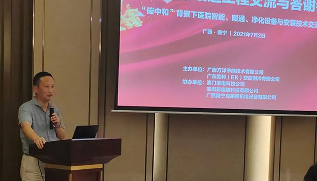 7月2日,由EK空調和EK核心經銷商廣西萬洋節(jié)能技術有限公司主辦,澳門紫電科技公司、深圳邦德瑞科技有限公司、廣西南寧克萊德機電設備有限公司協(xié)辦的綜合醫(yī)院暖通工程交流與答謝會在南寧荔園維景國際大酒店隆重舉辦。EK柳州辦事處經理周文光、EK南寧辦事處經理王勝龍、華藍設計(集團)有限公司建筑機電與環(huán)保設計所所長李申、廣西制冷協(xié)會會長黃孝軍以及醫(yī)院暖通設計專家和醫(yī)院工程總承包單位朋友齊聚一堂,共襄盛會。